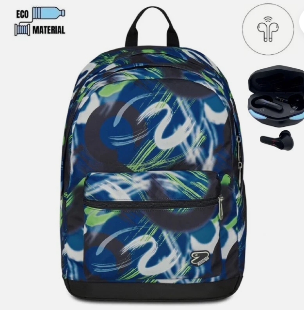 Zaino reversibile con earphones wireless: un lato in fantasia,